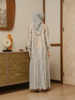 Material: Armani Sateen Finish Description: 100% Polyester Dress panjang dengan permainan motif lembut yang menyatu dengan desain. Siluetnya mengalir dan anggun, menciptakan tampilan feminin yang elegan dan nyaman dikenakan saat momen spesial.